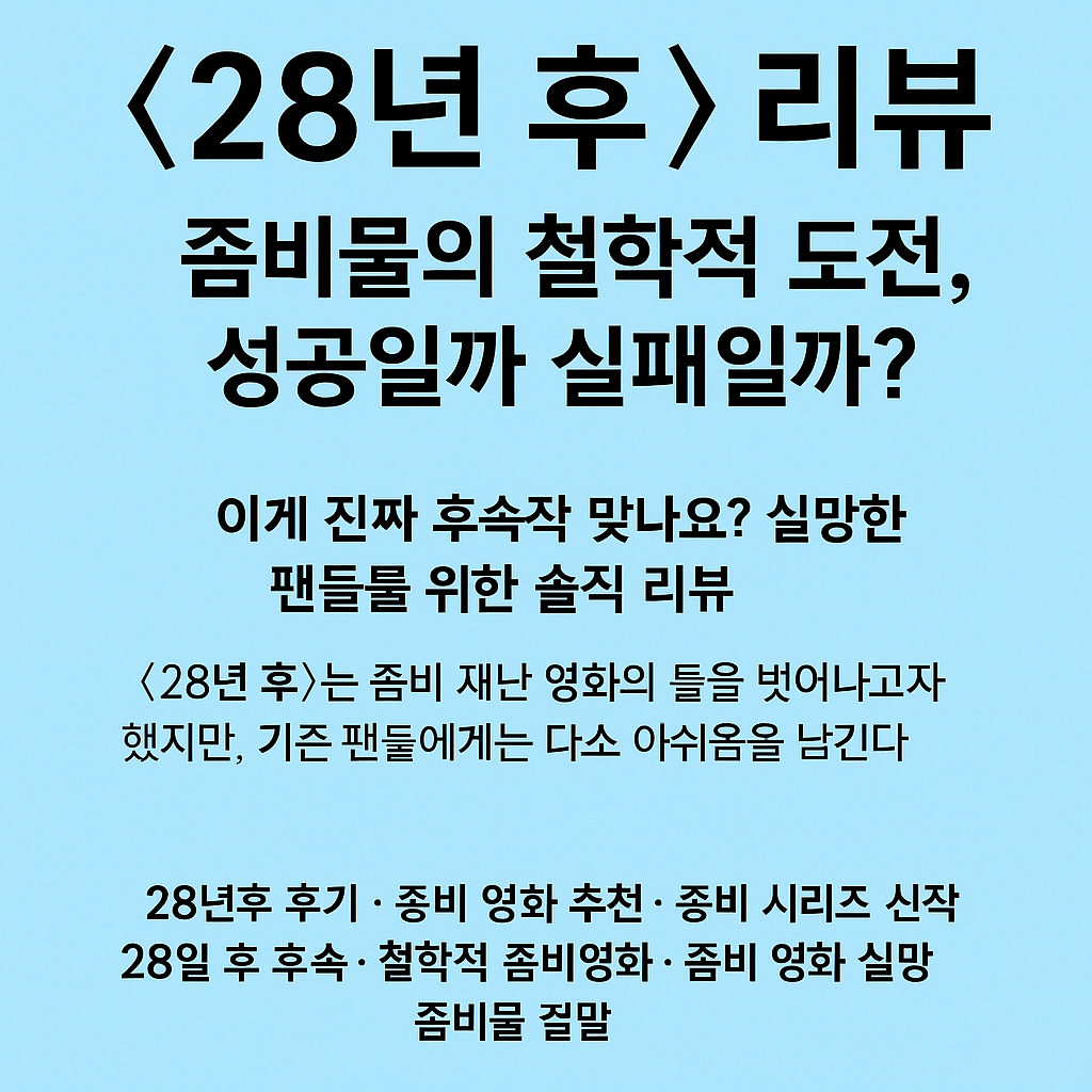 〈28년 후〉는 전작 팬들에게는 아쉬움을 남기지만, 새로운 시도를 하려는 용기만큼은 높이 평가할 수 있습니다. 기존 좀비물의 익숙한 클리셰를 벗어나려 했다는 점은 분명하지만, 이야기의 짜임새와 감정선, 설정 간 개연성이 부족해 완성도 면에서는 아쉽습니다. 좀비물에 철학을 접목하고자 한 이 시도가 성공이라 보기는 어렵지만, 한편으로는 장르를 넘나드는 새로운 가능성을 본 셈입니다.